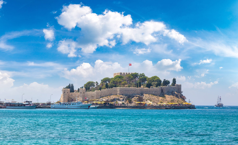 Güvercinada Fortress, located in the Hacıfeyzullah District of Kuşadası City, was built on the mouth of the harbour to protect it. There is an inner fortress (built by Barbaros Hayrettin Pasha) and fortress walls (built by İlyas Aga) on the island. These walls were built to protect against the expected attacks from the Greek islanders and from the sea during the Mora Revolt period. The stones used in construction of the fortress were transported from Yılancı Cape. The architecture of the castle is pentagonal. There is an inscription at the entrance of the castle. The island was also known as the Pirate Castle because it served as a police station against pirates during the Ottoman period. The tower, located at the highest point of the island, was used by guards on watch.